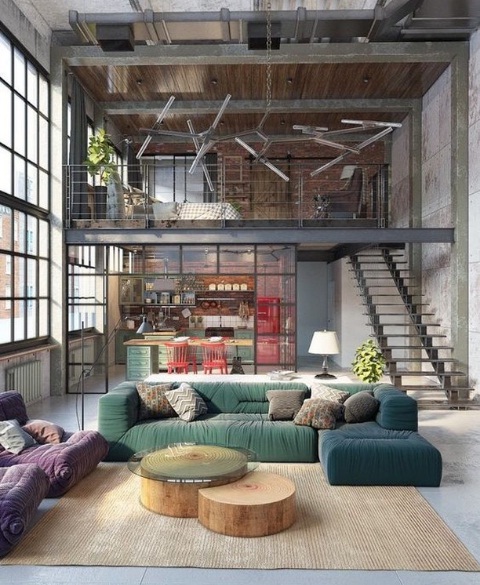 Redecorate with concrete and rustic metals: For a more literal interpretation of this design trend, exposed ceilings with concrete beams bring a rough yet stylish touch to your living room. Metal staircases and grey flooring can also contrast effortlessly against plush sofas in faded violet, green and blue tones.