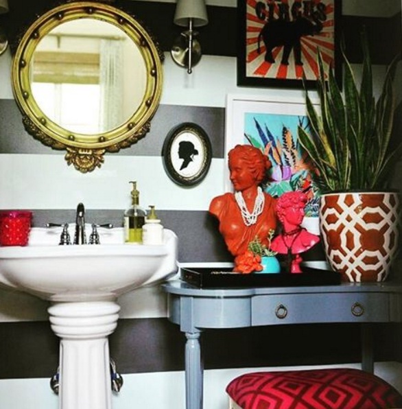 Create a pop art themed bathroom with sculptural elements: The inclusion of the pop art trend can truly help you embrace the sculptural trend. Turn to black and white striped walls contrasted against a classic white porcelain sink, and adorn your bathroom with vivid orange and pink bust sculptures. Meanwhile, framed wall art and a metallic round mirror help to complete the theme.