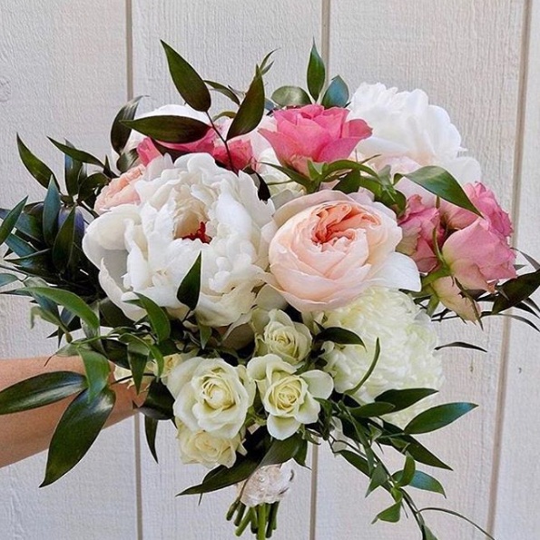 Use creamy white florals for a delicate statement: If you’re not a fan of extreme hot pinks, lean toward softer hues for a dainty bouquet instead. Heavenly white gardenias and pale pink roses or tulips can be combined for a beautifully understated arrangement.