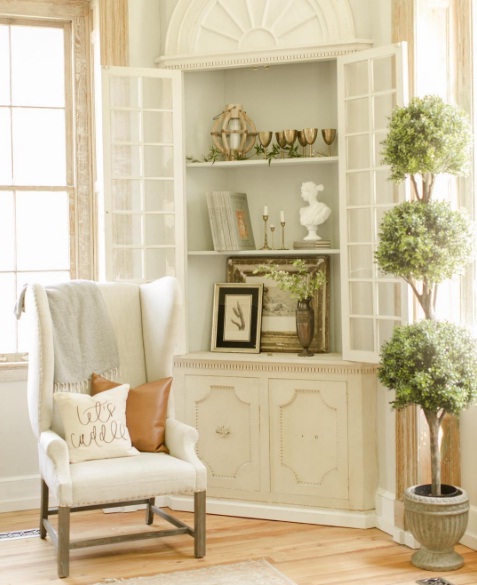 Use a tan leather pillow to bring a sophisticated effect to your space: If you’re a fan of neutral décor, try revamping your space with a leather accent pillow in a warm shade of tan or camel. Place the cushion on a white armchair, and turn to pristine white shelves, potted plants and metallic photo frames to beautifully complement the leather.