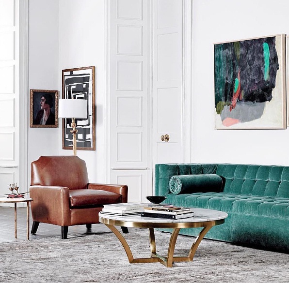 Bring a dark brown leather armchair into your space: While the timeless black leather couch may have once been a mainstay at home, shades such as chocolate brown and cognac are equally gorgeous. Try decorating with a dark brown leather armchair, and contrasting this smooth fabric with a velvet sofa in a bright jewel tone. Meanwhile, ivory walls, a marble coffee table and a plush grey accent rug all help to complete the look.