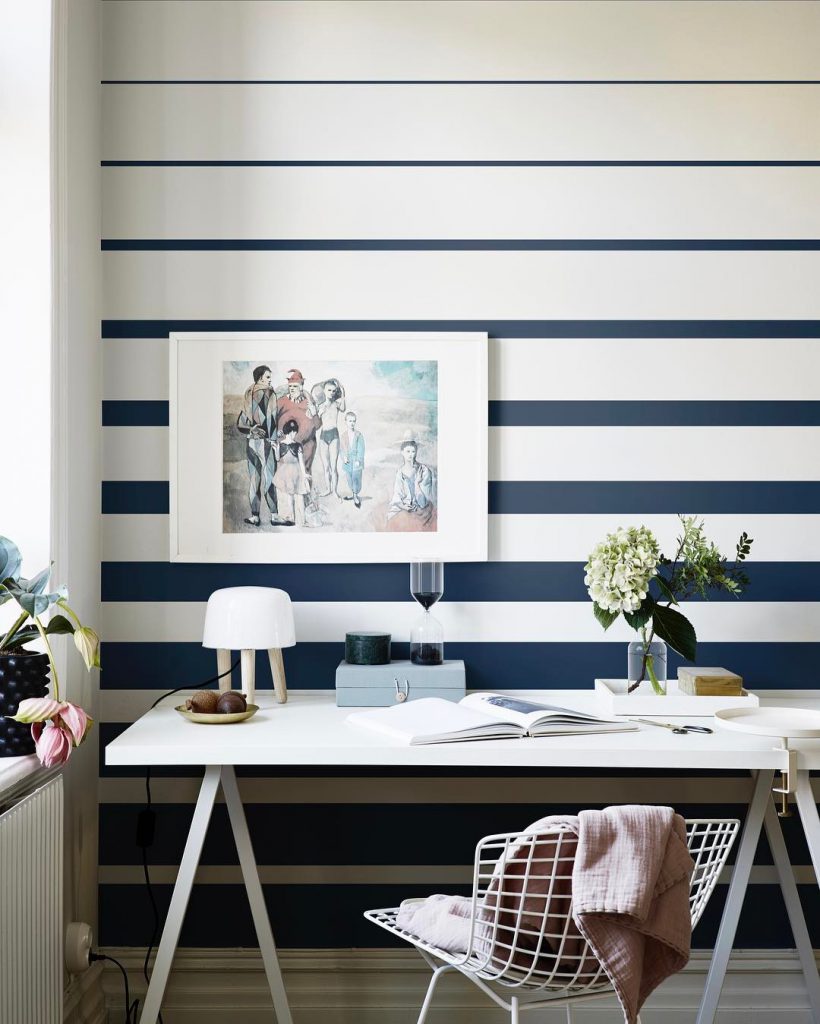For corporate types who want a chic yet efficient space to wrap up business, try bringing broad navy and white stripes into your home office. The classic colour scheme is trendy without looking overly funky, while the navy blue tones are an understated choice. A slender white desk and a metallic ivory chair help to complete the look.