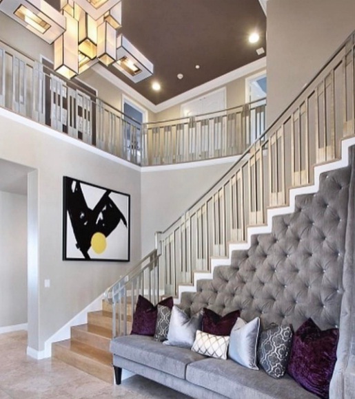 Upgrade a neutral living room with acrylic railings: If your space is currently an understated sight with plush grey sofas and beige walls, try accenting the soft neutrals with an acrylic banister rail. Meanwhile, abstract artwork and a series of violet and silver accent cushions can bring a hint of springtime into your room.