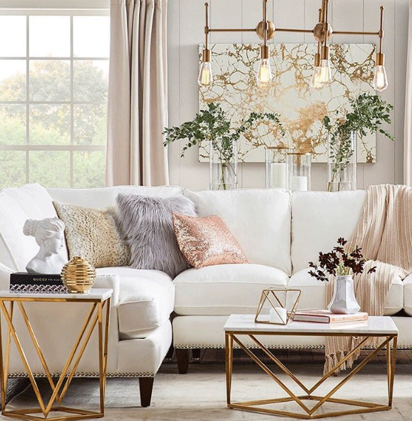 Transform your living room with brass mini tables: For the ultimate living room, try accessorizing with a slender brass coffee table and a mini table. Meanwhile, the look of an ivory sofa, blush pink curtains and pink and grey accent cushions can help to inject elegance into your space.