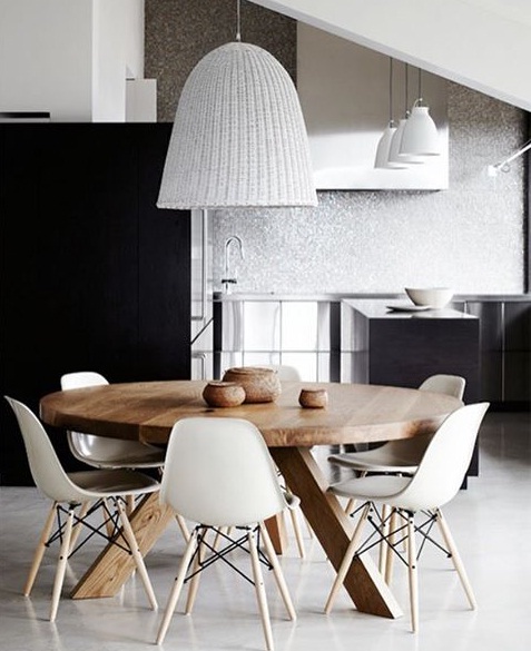 Use a round wooden table for a chic and unconventional finish: For anyone who wants to avoid the traditional long dining table, a circular wooden table just may be your solution. Add funky seats, a white crochet lampshade and a grey and white colour scheme for the ultimate space.