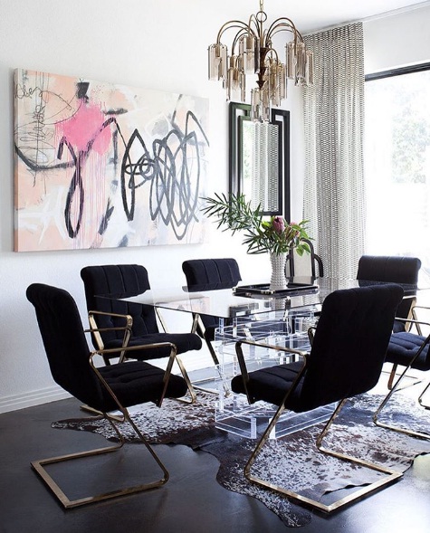 Complete your dining room with a glasstop table and plush black chairs: While wood is certainly a popular material for the average dining room, the look of clear glass can also impart elegance. A glasstop dining table offers a modern touch, while black seats provide an edgy contrast. For a finishing touch, adorn your walls with colourful artwork and dangle a gold metallic chandelier from your ceiling.