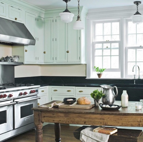 Paint your kitchen cabinets with a burst of pistachio: While many of us dream of bright kitchen cabinetry, it’s sometimes hard to incorporate colourful hues into a neutral space. If your cabinets are crying out for colour, try re-painting them in pistachio. Turn to silver appliances, an antique wooden table and pendant lamps for the ultimate finish.