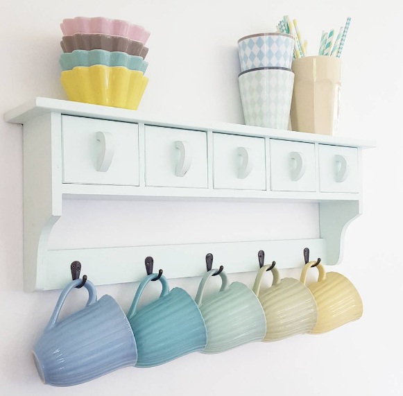 Experiment with delicate pistachio shelving: After all, there’s no hard rule that wooden wall shelving must be plain white or black. For those who want to incorporate springtime pastels into their spaces, contrast pistachio painted shelves with decorative ceramic mugs and dishware.