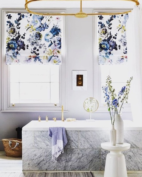 Combine lavender and blue with hints of gold: To instantly revamp a neutral bathroom, try adorning your white-painted windows with pale purple and blue floral curtains. Meanwhile, a marble tub with gold fixtures can bring a hint of luxury into your space. Add lavender branches in a minimalist white vase, and prepare to transform a humble bath area into a blossoming spa-like paradise.