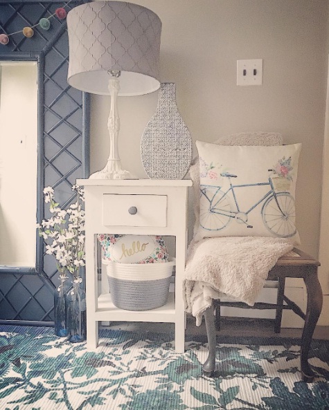 Try a vintage inspired area rug and shades of periwinkle and ivory: Whether it’s your family room or den that needs an upgrade, soft pastel shades and vintage touches can lend a whimsical air. An ivory-painted side table, airy white lampshade and area rug accessorized with blue and white antique-looking blossoms also wrap up the space.