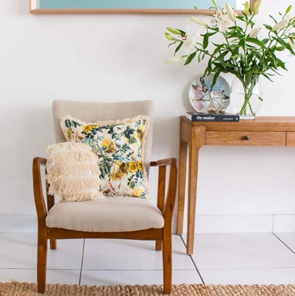 Turn to a floral printed cushion and linen fabrics for an easy upgrade: All it takes is the perfect pillow to transform a dull and dreary living room into the ultimate inviting haven. Try adorning your favourite linen armchair with a pom pom-fringed accent pillow in a splashy yellow floral print. Meanwhile, a textured woven area rug, wooden table and fresh blossoms in a clear glass vase can complete your space.