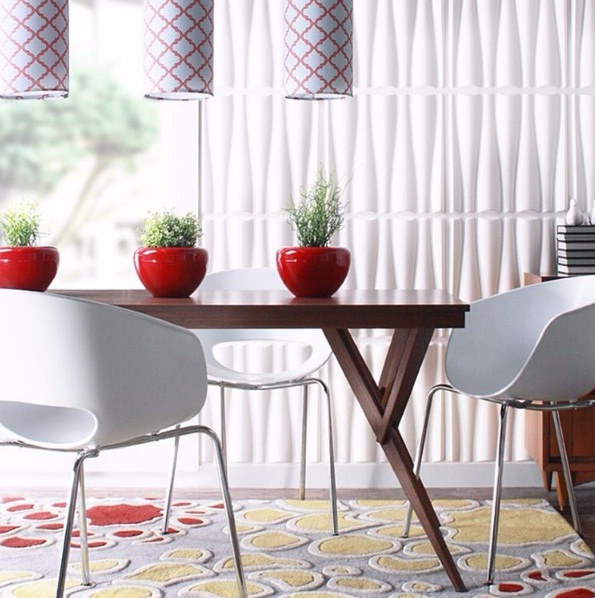 Turn to bamboo for a trendy and environmentally conscious alternative: For a change from the usual woods, try experimenting with bamboo at home. Decorating your home with bamboo wall panels can bring exotic influences into your humble urban space. To balance out the brown tones of the bamboo, turn to slender and modern white chairs, red ceramic dishes and brightly coloured area rugs.