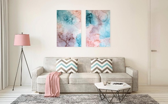 Create a watercolour oasis: For a splash of colour, turn to blue and pink shades for your framed wall art. Pastel-toned watercolour paintings can instantly evoke a feeling of calm and relaxation, and help to decorate your living room in style. The look of a soft grey sofa, pale pink lampshade and patterned accent pillows can help to complete your decorating scheme.