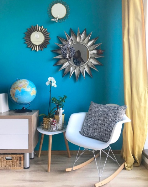 Evoke sunny days with a sunburst mirror: As we prepare for picnics and garden parties, why not bring the sunny spirit of the season indoors? A hanging silver sunburst mirror easily accents a sky blue accent wall. For a trendy effect, try arranging a series of smaller sunburst mirrors around the larger and more opulent one.