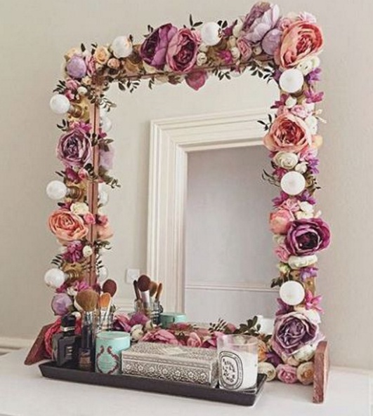 Be bohemian with florals: While metallic accents are always en vogue, floral-accented mirrors pay homage to springtime weather and the season’s boho chic trend. Turn to a long rectangular mirror adorned with faux flowers, or even consider real dried roses in pink and purple tones. If you want to bedeck your bedroom or vanity, a garden themed looking glass could be the ladylike finishing touch you need.