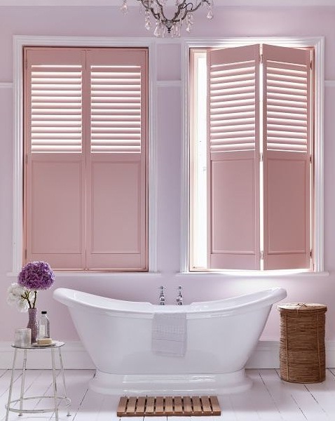 Try painted wooden shutters for a bathroom makeover: With countless décor lovers searching for ways to upgrade their bathroom, trendy wooden shutters can offer the dose of colour that you need. Paint these shutters in a shade of pale dogwood, for a contrasting effect against a white porcelain bathtub. Meanwhile, an accent wall in this new Pantone Universe tone can complete the look.