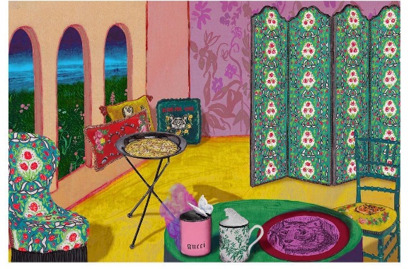From chairs and pillows to plates and candles, the furnishings are said to be created with vinyl, silk and paper wallpapers. Artist Alex Merry has also collaborated with Gucci on the collection, and a few of his illustrations are featured on the pieces.