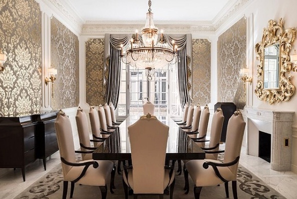 Channel Victorian beauty at home: For a taste of the past, try redecorating your home with embossed gold wallpaper and ornate furnishings. A gleaming black table, upholstered beige seats and an intricate gold mirror help to complete the beautiful effect and usher Victorian charm into your humble home.