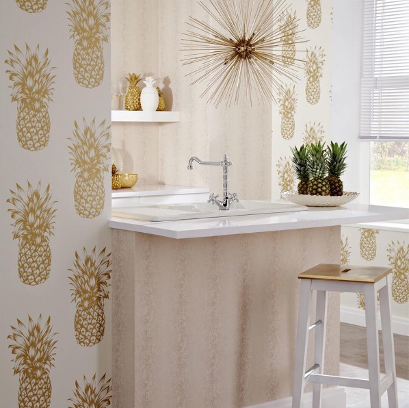Think tropical island style: Even if you reside downtown and you’re far away from a tropical oasis, gold pineapple wallpaper can easily transform your home into the island of your dreams. White wallpaper adorned with shining metallic pineapples can brighten up just about any kitchen. Meanwhile, white countertops and walls contrast effortlessly against the funky patterned walls.