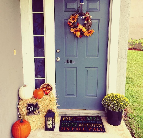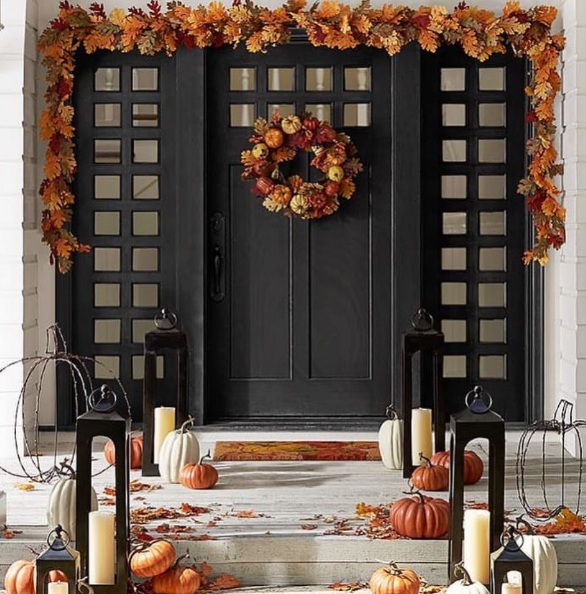 Traditional orange leaves: Naturally, rich, invigorating shades of orange are fairly typical of the season. Place handfuls of faux autumn leaves around the top of your front door, in order to create a type of banner. Along with scented candles, dark metallic lanterns and a coordinating front door wreath, this décor idea can leave you ready for fall.