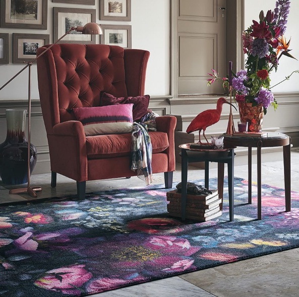 Plum tones: For a rich, seasonally appropriate take on florals, try integrating plum and deep violet shades into your design palette. The look of a flowery carpet can brighten a living room space, with a red velvet sofa for a finishing touch. Add a decorative flamingo, framed artwork and printed accent cushions to seal the deal.