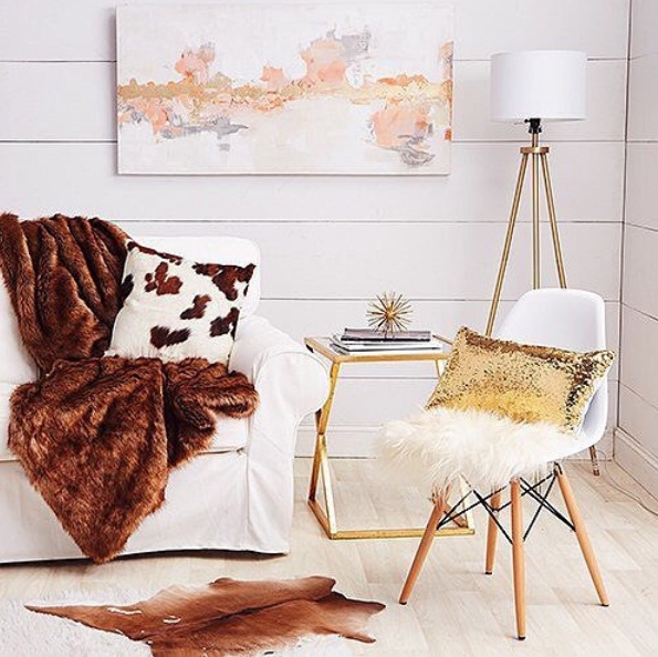 Brown and white fur: Decorate your living room with brown and white fur for a hint of neutral texture. We are liking the idea of a luxurious brown fur blanket, layered over a white sofa and styled with a matching pillow. Meanwhile, a glittery gold pillow and a shaggy area rug can bring the entire room together.