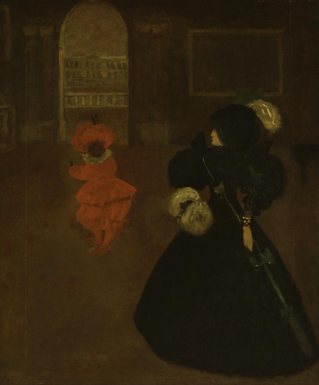 On one side of the piece is a work called Caprice, which shows a woman following a small man in a red outfit towards a door. The work has been part of the Tate collection since 1923, but the gallery has only shown the one side of it when it has been on display. On the other side is a painting of a masked woman and a mouse. Who the women is, or what the name of the painting is is unknown.